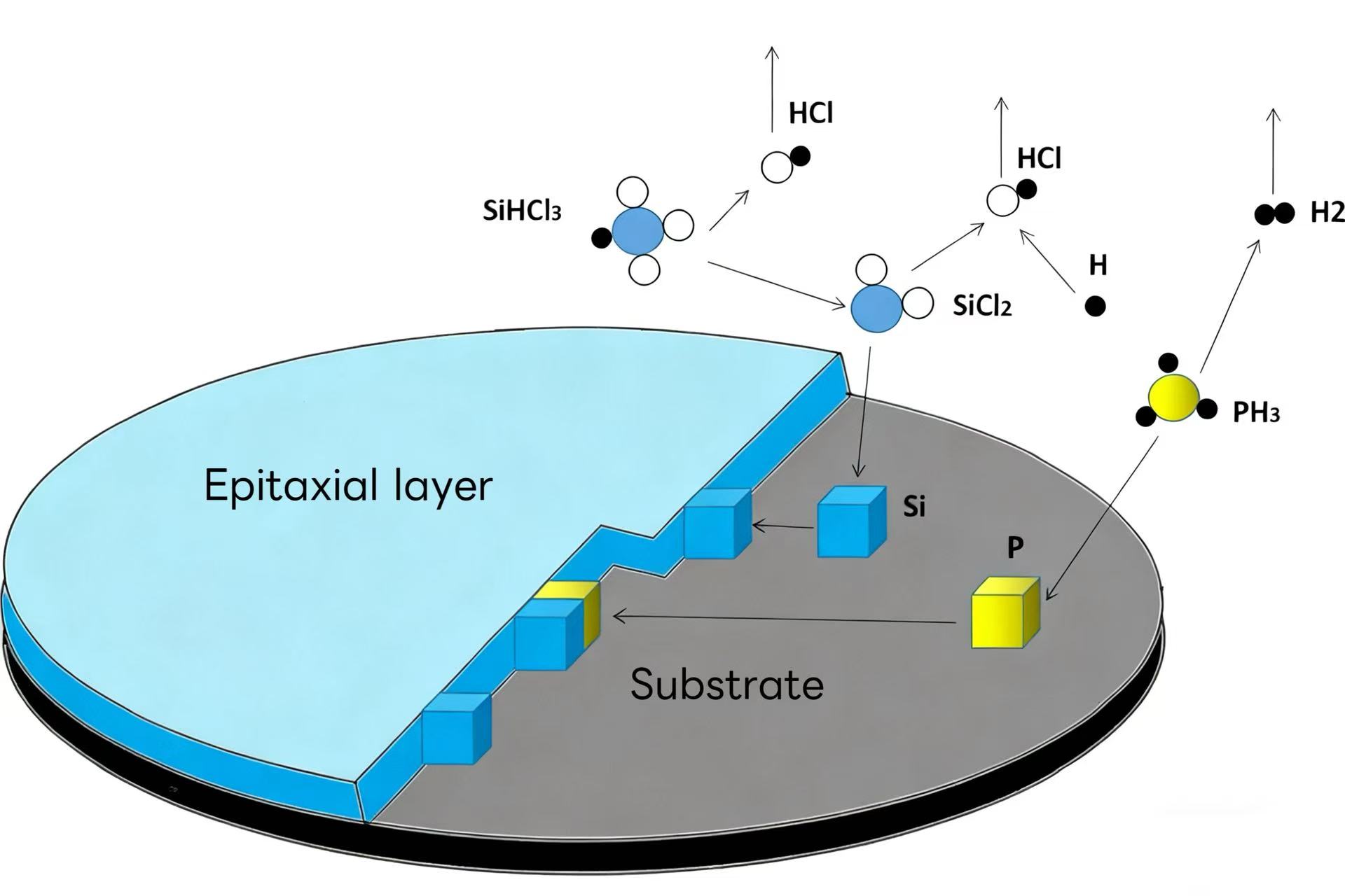 Silikonová epitaxe obecně používá epitaxní pec v parní fázi. Jeho princip spočívá v tom, že rozklad zdroje křemíku (jako je silan, dichlorsilan, trichlorsilan a chlorid křemičitý reaguje s vodíkem za vzniku křemíku. Během růstu mohou být současně zaváděny dopovací plyny jako PH3 a B2H₆. Koncentrace dopingu je přesně řízena parciálním tlakem plynu, aby se vytvořila specifická epitaxní vrstva se specifickou epitaxní vrstvou.