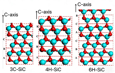 Materiál SiC samozřejmě není složen z jednoho čtyřstěnu o jednom atomu Si a jednoho atomu C, ale z bezpočtu atomů Si a C. Velký počet atomů Si a C tvoří zvlněné dvojité atomové vrstvy (jedna vrstva atomů C a jedna vrstva atomů Si) a četné dvojité atomové vrstvy se skládají za vzniku krystalů SiC. V důsledku periodických změn, ke kterým dochází během procesu vrstvení vrstev Si-C s dvojitým atomem, v současnosti existuje více než 200 různých krystalových struktur s odlišným uspořádáním. V současné době jsou nejběžnější krystalové formy v praktických aplikacích 3C-SiC, 4H-SiC a 6H-SiC.
