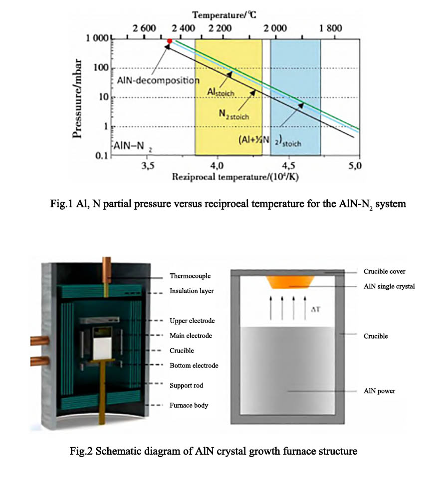 Hlavní kroky procesu jeho růstu jsou následující: (1) sublimace surového prášku AlN; (2) přenos surovin v plynné fázi; (3) adsorpce složek plynné fáze na růstovém povrchu; (4) povrchová difúze a nukleace; (5) desorpční proces [10]. Krystaly AlN se za standardního atmosférického tlaku začnou pomalu rozkládat na páry Al a dusík při teplotě kolem 1700 °C. Když teplota dosáhne 2200 °C, rozkladná reakce AlN rychle zesílí. Obrázek 1 je křivka ukazující vztah mezi parciálním tlakem produktů v plynné fázi AlN a okolní teplotou. Žlutá oblast na obrázku je procesní teplota krystalů AlN připravených metodou PVT. Obrázek 2 je schematický diagram struktury růstové pece krystalů AlN připravených metodou PVT.