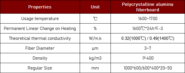 Polykrystalickýoxid hlinitýdřevovláknitá deska je vyrobena z polykrystalické aluminovláknité bavlny jako základní suroviny, kombinovaná s anorganickým žáruvzdorným kamenivem, anorganickými žáruvzdornými prášky a speciálními přísadami a po smíchání ve specifickém poměru zpracována speciální technikou. Jeho primární krystalickou fází je korund, doplněný malým množstvím mullitu. Synergický efekt dvou krystalických fází propůjčuje polykrystalické aluminovláknité desce vynikající žáruvzdorné vlastnosti a vysokou teplotní stabilitu. Díky své mimořádné zpracovatelnosti lze polykrystalickou aluminovláknitou desku zpracovávat do různých tvarů a velikostí tuhých nepravidelných dílů dle požadavků zákazníka.
